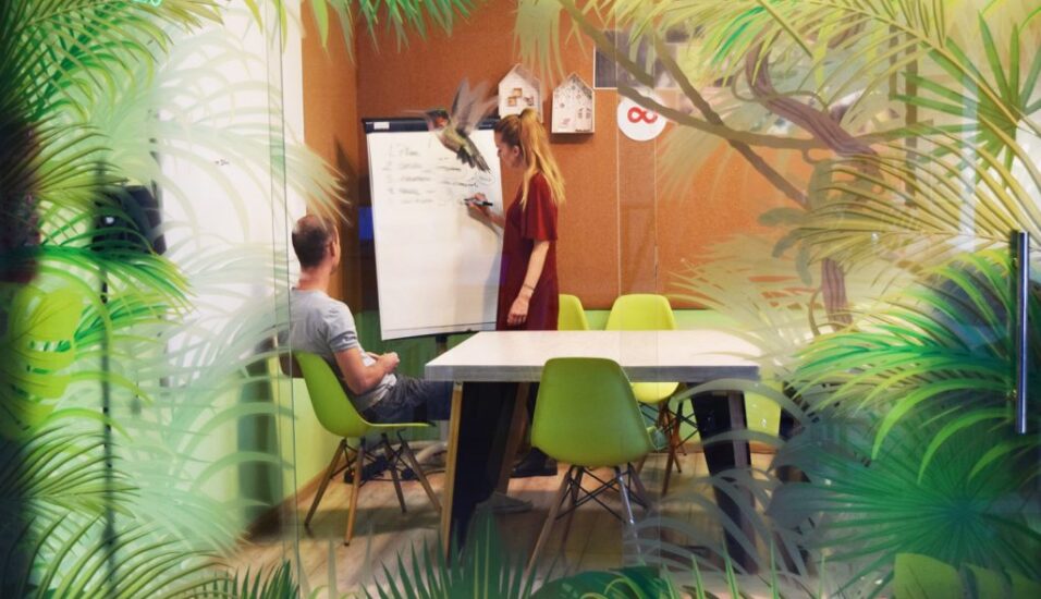 15-metrowa, zaciszna salka konferencyjna, przeznaczona maksymalnie dla 10-12 osób. Szklane drzwi z relaksującym motywem egzotycznego lasu, oddzielają ją od przestrzeni typu open space. Ogromne okno wychodzi na pełną energii ulicę Sienkiewicza.